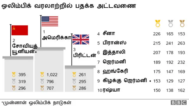- 43 தங்கப் பதக்கங்களை பெற்று, தொடர்ந்து இரண்டாவது ஒலிம்பிக் போட்டியாக பதக்கப் பட்டியலில் முதலிடம் வந்துள்ள அமெரிக்கா, மொத்தத்தில் இது வரை 17 முறை பதக்கப் பட்டியலில் முதலிடம் பெற்றுள்ளது.