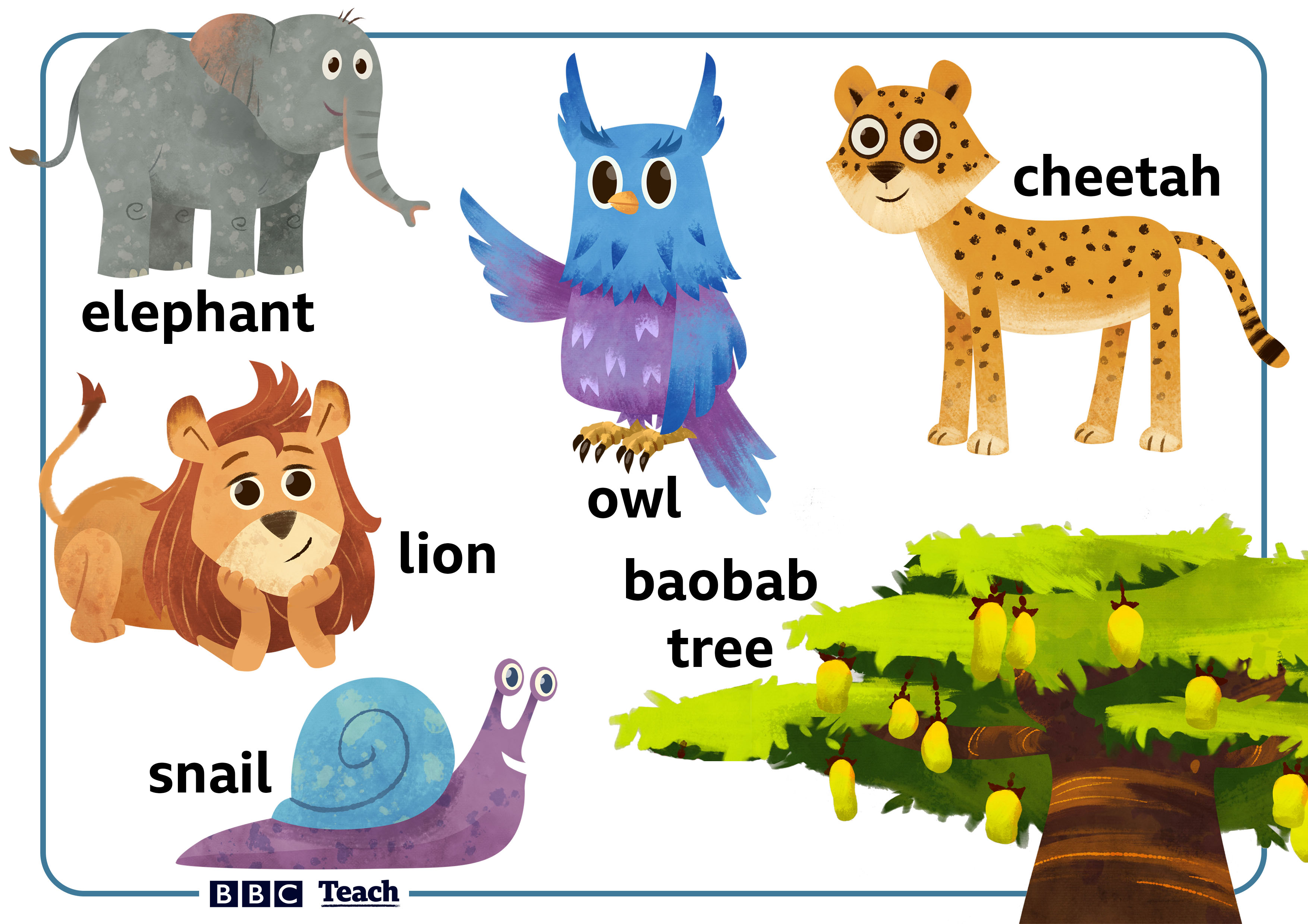 Together, the animals travel to an old tree in a clearing where they repeat the wise owl's words: Baobab, Baobab, Baobab. With a rumble the magical Baobab Tree springs into life. Water flows from its roots and fruit grows from its branches as everyone says "thank you" to the snail. The tree climbing animals share out fruit and they all take great gulps of water.