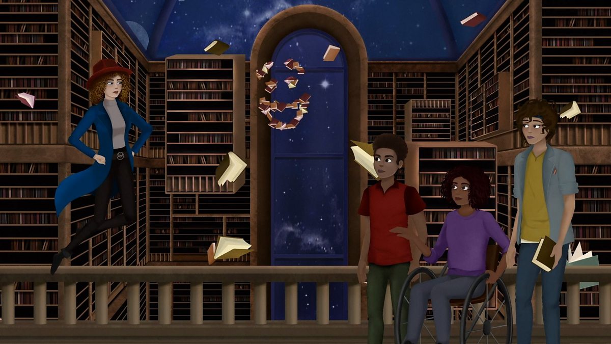 Finding themselves in space, Olivia and Hassan watch mathemagician Hypatia perform long multiplications in the sky by bending the stars.