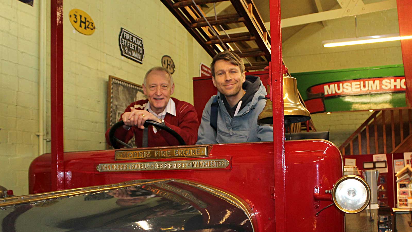 Focus image: Ben in an old fire engine with Bob Bonner of the Greater Manchester Fire Service museum. image