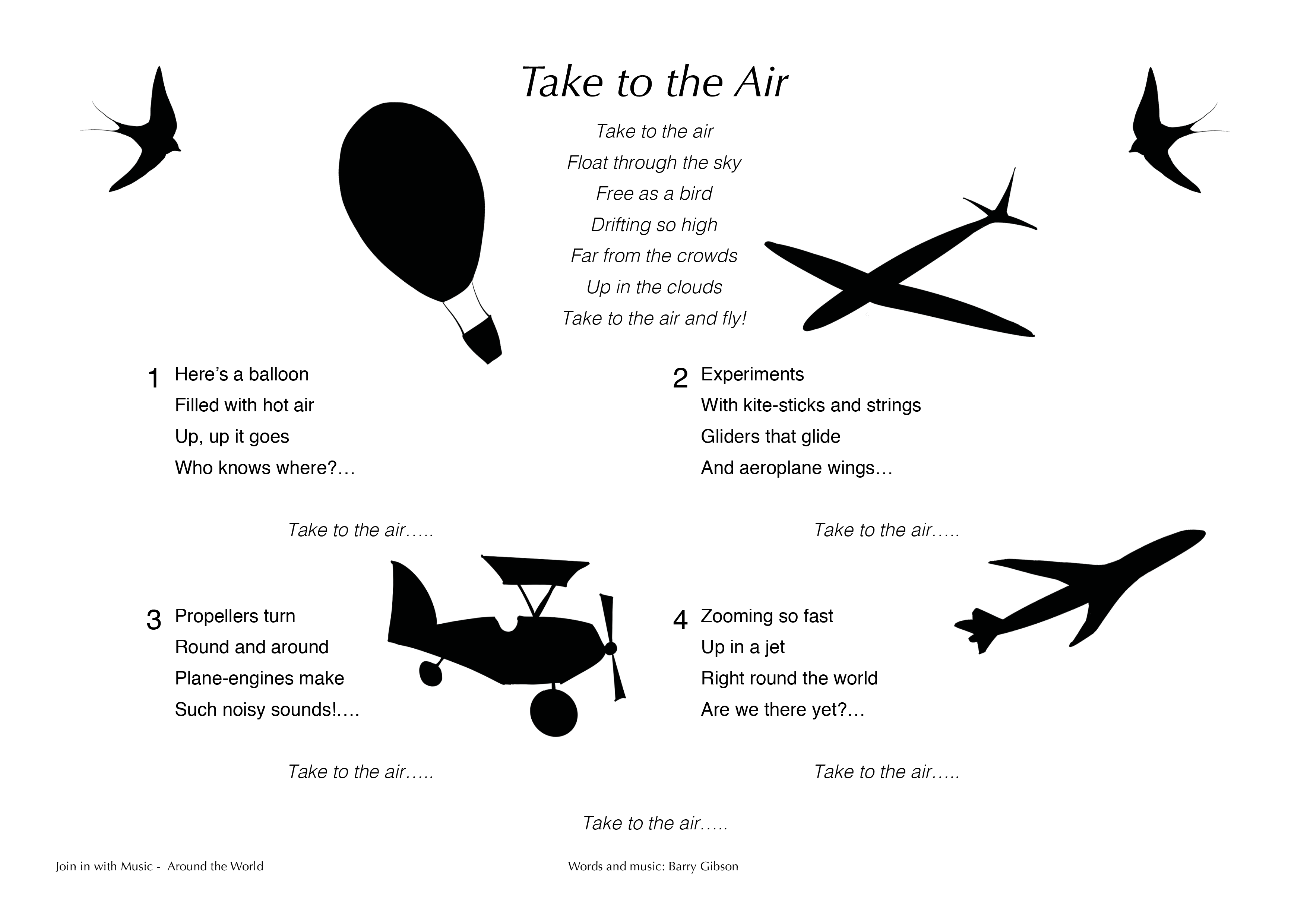 - There are also four verses, each going gradually up a C major scale, about hot-air balloons in Verse 1 (xylophones might join in with this); kites, gliders and plane wings in Verse 2 (string instruments can join in with this); propellers and noisy plane engines in Verse 3 (keyboards and tuned percussion might join in with this); and jets zooming around the world in Verse 4 (steel pans and panpipes could join in with this).