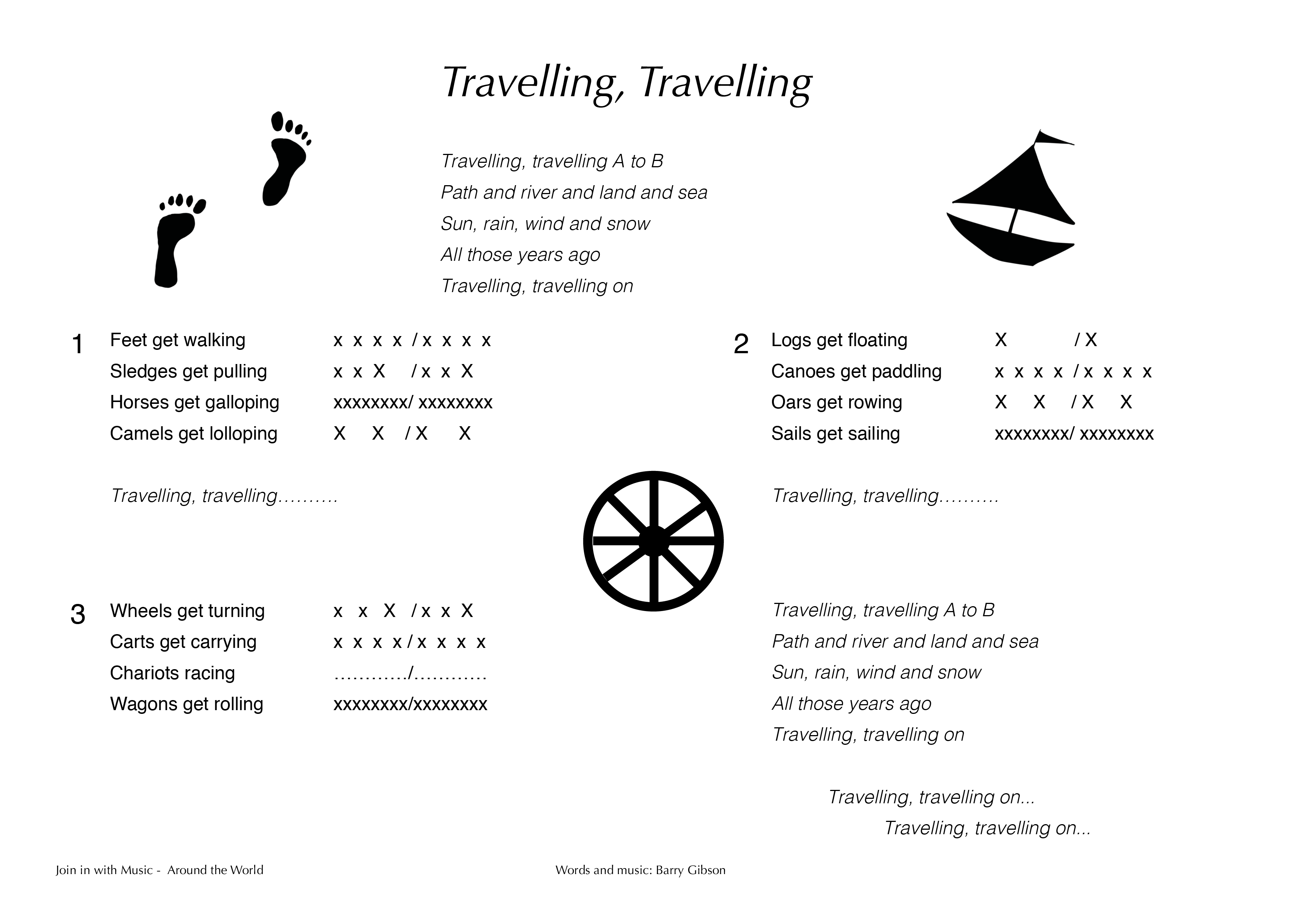 This thoughtful piece has elements of music drawn from many parts of the world to explore the early history of human movement and transport. There are lyrics about travelling by foot and boat across path, river, land and sea through all weathers; about using sledges, horses and camels; and about using wheels to move carts, chariots and wagons. As well as saying or singing the words, pupils can play various percussion patterns to evoke each method of travelling.