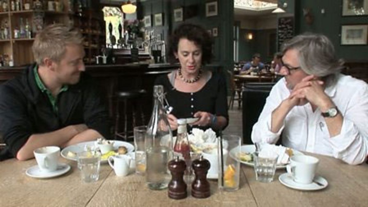 Female, dark hair, dark bead necklace, dark top: Ah, the bill's £30 so we've got to divide that up.