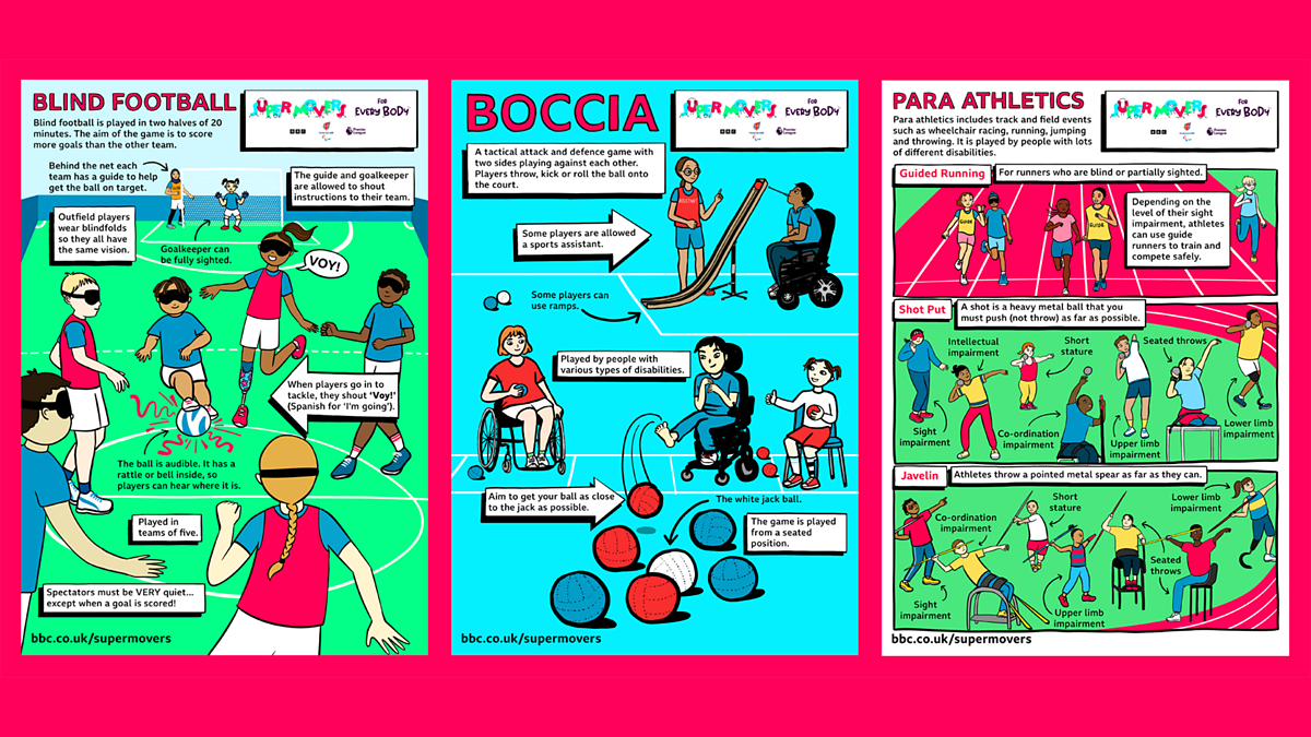 Super Movers for Every Body has collaborated with Paralympian and artist Sophie Kamlish to create informative, fun and eye-catching posters on the inclusive sports blind football, boccia and Para athletics.