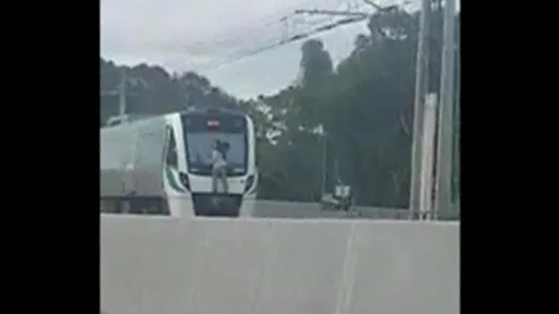 హై స్పీడు రైలుకి వేలాడుతూ 25 కి.మీ. ప్రయాణం