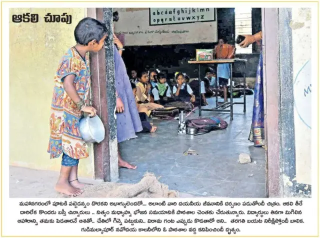 ‘‘ఆకలి తీరే దారి లేక కొందరు బస్తీ చిన్నారులు నిత్యం మధ్యాహ్న భోజన సమయానికి పాఠశాల చెంతకు చేరుతున్నారు. విద్యార్థులు తినగా మిగిలిన ఆహారాన్ని తమకు పెడతారన్న ఆశతో చేతిలో గిన్నె పట్టుకుని తరగతి గది బయట బాలిక నిరీక్షిస్తోందీ బాలిక’’ అంటూ చిత్ర వివరణ ఇచ్చారు.