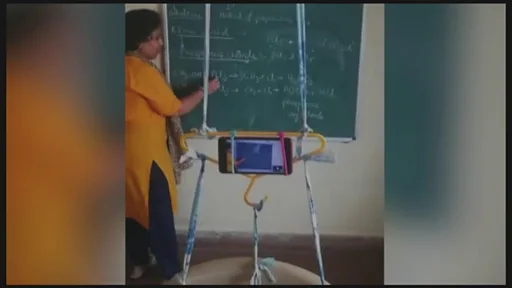 ఆ ట్రైపాడ్ను పరిశీలిస్తే.. కొన్ని బట్టలతో చేసిన తాళ్లు, సీలింగ్కి కుర్చీకి వేలాడదీసిన బట్టలు ఆరేసుకునే హ్యాంగర్ కలిపి ఒక తాత్కాలిక ఏర్పాటులా అనిపించింది. మొబైల్ ఫోన్ని నిలకడగా ఉంచడానికి రెండు రబ్బర్ బాండ్లు. కుర్చీలో పెట్టిన ఆ మొబైల్ ఫోన్లో ఆమె బ్లాక్ బోర్డు మొత్తాన్ని కనిపించేలా ఏర్పాటు చేశారు.