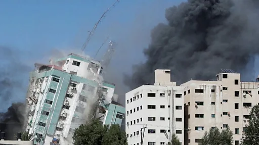 గాజాలో అసోసియేటెడ్ ప్రెస్, అల్ జజీరా వార్తా సంస్థల కార్యాలయాలు ఉన్న ఒక బహుళ అంతస్తుల భవనం శనివారం మధ్యాహ్నం ఇజ్రాయెల్ జరిపిన వైమానిక దాడిలో కుప్పకూలింది.
