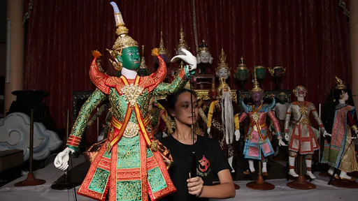 หุ่นกว่าสิบตัวตั้งแต่ฤๅษี ลิง ยักษ์ และมนุษย์ ยืนเรียงรายอยู่บนเวที ส่วนรอบห้องก็แน่นขนัดไปด้วยอุปกรณ์ประกอบฉาก เช่น ก้อนหิน ต้นไม้ และภูเขา เมื่อมองอย่างผิวเผิน ที่นี่อาจดูเหมือนโรงเรียนสอนนาฏศิลป์ปอน ๆ ทั่วไป
