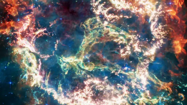 ภาพอินฟราเรดของ แคสเอ ที่กล้องโทรทรรศน์เจมส์เว็บบ์บันทึกไว้ ได้ถูกดัดแปลงให้กลายเป็นแสงสีที่ตามนุษย์สามารถเห็นได้ โดยแสงสีแดงและส้มในภาพบริเวณรอบนอกของซากซูเปอร์โนวานี้ แสดงถึงกลุ่มฝุ่นผงที่มีอุณหภูมิอุ่น เกิดจากการที่วัตถุที่หลุดออกมาก่อนการระเบิดของดาวฤกษ์ พุ่งชนเข้ากับแก๊สและฝุ่นอื่น ๆ โดยรอบ