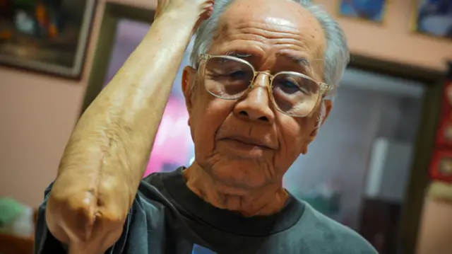 “มันก็เครียด มันก็แค้น ทรมานมันก็มี” เขาพูดพลางถลกขากางเกงให้เห็นขาที่ด้วนเกือบถึงเข่า แต่ยังพอใส่ขาปลอมได้ อย่างไรก็ตาม แผลตรงข้อเท้าขวาที่เนื้อแหว่งหายไป ทำให้เมื่ออายุมากขึ้น จึงต้องพึ่งรถเข็นเป็นหลัก