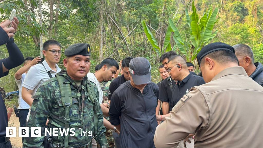 คำบรรยายภาพ, ตำรวจจับกุมตัว ร.อ.วิโรจน์ เกตุมณี (ใส่หมวดปิดหน้า) อดีตนาวิกโยธิน มือปืนในคดีลอบยิงนายกมลศักดิ์ ลีวาเมาะ สส. เขต 5 จ.นราธิวาส พรรคประชาชาติ ได้ที่ อ.สังขละบุรี จ.กาญจนบุรี หลังหลบหนีนานกว่าหนึ่งเดือน