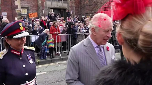 ฌอน ค็อกแลนด์ ผู้สื่อข่าวบีบีซีสายราชสำนัก รายงานว่า ขณะสมเด็จพระเจ้าชาร์ลส์ที่ 3 เสด็จพระราชดำเนินผ่านประตูมิเคลเกตบาร์ มีผู้ประท้วงหลายคนพร้อมป้าย “Not My King” หรือ “ไม่ใช่กษัตริย์ของเรา” และไม่กี่เมตรออกไป ก็มีผู้ปาไข่ออกมากหลายฟอง