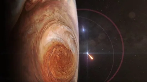 ทั้งนี้ ดาวพฤหัสบดีมีองค์ประกอบเป็นก๊าซไฮโดรเจนและก๊าซฮีเลียมเป็นส่วนมาก มีขนาดใหญ่กว่าโลก 300 เท่า โดยระยะเวลา 1 วันของดาว เท่ากับเวลาราว 10 ชั่วโมงบนโลก บริเวณที่มองเห็นเป็นแถบขวางตรงส่วนกลางของดาวคือกระแสลมรุนแรงที่พัดจากทิศตะวันออกไปทางทิศตะวันตก และจุดสีแดงใหญ่บนดาวคือพายุหมุนขนาดยักษ์ที่กว้างกว่าโลกสองเท่า