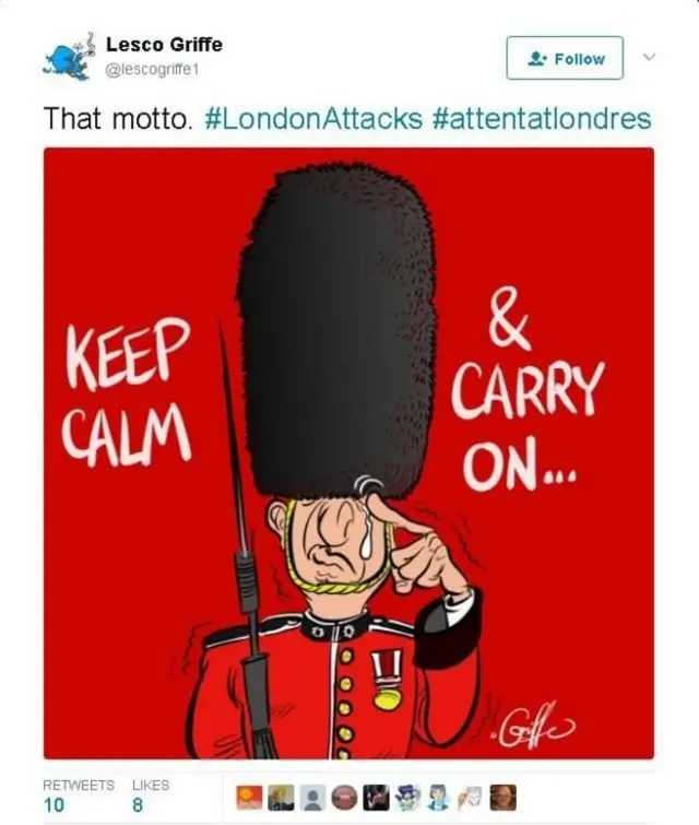 เลสโก กริฟฟ์ นักวาดการ์ตูนทวีตภาพการ์ตูนทหารในชุดสีแดงที่เป็นสัญลักษณ์ของอังกฤษกำลังเช็ดน้ำตา พร้อมกับคำว่า Keep Calm & Carry On (ตั้งสติและทำงานต่อไป)