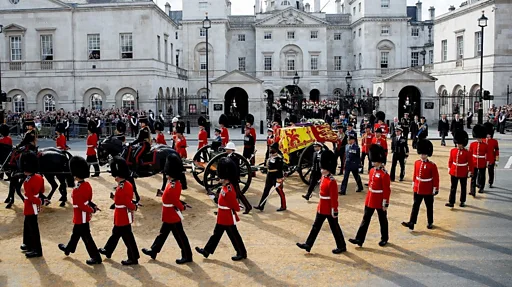 ในวันประกอบพระราชพิธีพระบรมศพ จะมีการเคลื่อนย้ายหีบพระบรมศพจากเวสต์มินสเตอร์ฮอลล์มายังมหาวิหารเวสต์มินสเตอร์ที่อยู่ใกล้กัน โดยใช้รถปืนใหญ่เกียรติยศ (State Gun Carriage) ของราชนาวีอังกฤษ ซึ่งมีการใช้งานครั้งสุดท้ายในพิธีศพของลอร์ดเมาต์แบตเทนเมื่อปี 1979 โดยมีทหารเรือ 142 คนเป็นผู้ลากจูงรถในครั้งนั้น เหล่าพระบรมวงศ์ซึ่งอาจรวมถึงกษัตริย์พระองค์ใหม่อาจจะเสด็จพระราชดำเนินมาในขบวนนี้ด้วย