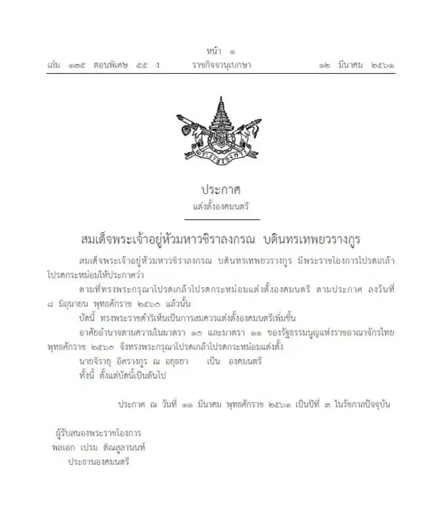วันที่ 12 มีนาคม 2561 เว็บไซต์ราชกิจจานุเบกษา เผยแพร่ประกาศแต่งตั้งองคมนตรี ความว่า สมเด็จพระเจ้าอยู่หัวมหาวชิราลงกรณ บดินทรเทพยวรางกูร มีพระราชโองการโปรดเกล้าฯ ให้ประกาศว่า ตามที่ทรงพระกรุณาโปรดเกล้าฯ แต่งตั้งองคมนตรี ตามประกาศลงวันที่ 8 มิถุนายน พุทธศักราช 2560 แล้วนั้น ทรงพระราชดำริเห็นเป็นการสมควรแต่งตั้งองคมนตรีเพิ่มขึ้น