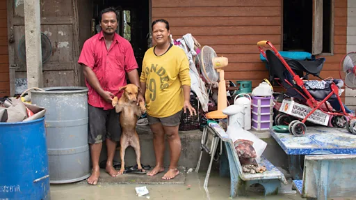 ภาพที่สองสามีภรรยาวัยไม่ถึง 40 ปีคู่นี้เห็น คือ น้ำท่วมสูงเข้ามาในบ้าน ระเบียงหลังบ้านไม่เหลือซาก อุปกรณ์การช่าง ซึ่งเป็นเครื่องมือหาเลี้ยงชีพเสียหายใช้ไม่ได้อีก เช่นเดียวกับ ที่นอน ตู้เย็น คอมพิวเตอร์ เครื่องซักผ้าหน้าบ้าน และเครื่องใช้ไฟฟ้าทุกอย่าง