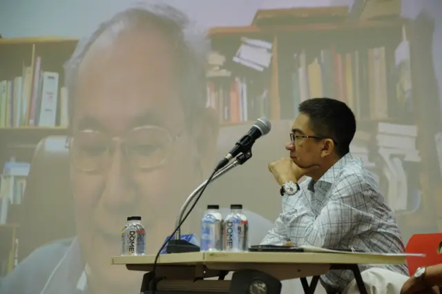 "แต่เจ้าหน้าที่บอกว่าเจ้าหน้าที่ชอบเอาขนมไปฟรี ฟังไม่จบ ถ่ายรูปแล้วก็หนีไปก่อน.. เราเป็นงานเสวนาเปิดเผย ภาพมาขอจากคณะได้ ส่วนไฟล์เสียง เอาได้จากศูนย์วิจัยดิเรกฯ ได้ และอย่าลืมกดติดตามด้วยจะได้เพิ่ม KPI ให้คณะ" เขากล่าวก่อนแนะนำวิทยากรผู้ร่วมเสวนา