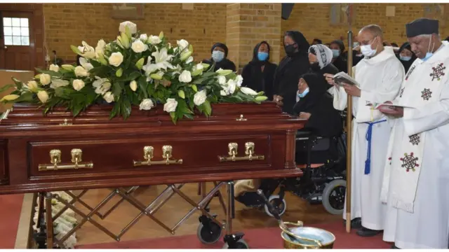 ከምቲ ንቡር ባህሊ ስርዓተ ቀብሪ ከኣ ካህናት፡ ኣብ ቤት መዋቲ መጺኦም ጸሎት ድሕሪ ምግባር ጸሎተ ፍትሓት ናብ ዝግበረሉ ኣብ ሰሜናዊ ክፋል ለንደን ኣብ ሃሪንገይ ናብ እትርከብ "ኣዋር ሌይዲ ኦፍ ሙስወል" ዝተባህለት ብ1917 ዝተመስረተት ቤተክርስትያን ኣሰንዮሞ ተጓዒዞም።