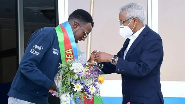 በኹሪ ጸሊም ኣፍሪቃዊ ተዓዋቲ ግራንድ ቱር ቢንያም ግርማይ ኣብ ኣስመራ ድሙቕ ኣቀባብላ ተጌሩሉ