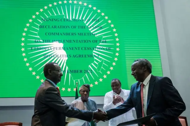ኣብ ዝሓለፈ ወርሒ፡ ድሕሪ ፕሪቶርያ ኣብ ናይሮቢ ኣብ ዝተኻየደ ዘተ፡ ክልቲኦም ወገናት ጐንጺ ደው ከብሉ፡ ሰብኣዊ ሓገዝ ክኣቱ፡ መሰረታዊ ኣገልግሎታት ክምለሱን ሓይልታት ትግራይ ዕጥቆም ክፈትሑን፡ ማዕረማዕረኡ፡ 'ሓይልታት ወጻኢን ካብ ሰራዊት ምክልኻል ፈደራል ወጻኢ ዝዀኑ ዕጡቓት ሓይሊታት ክልላት' ክወጽኡን ምስምማዖም ይዝከር።