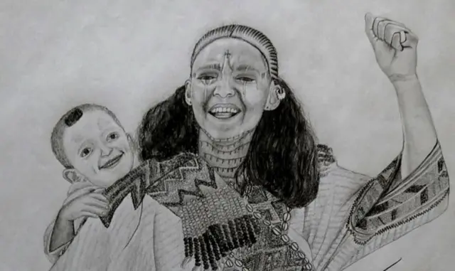 እታ ስእሊ፡ ኣብ ዝባና ቈልዓ ዝሓዘለት'ሞ፡ ኣብ መንጐ እቲ ብዕስለ ኣንበጣ ሃሰያ ዝወረዶ ሕርሻኣ ኰይና ጓሂኣን ድኻማን ኣብ ገጻ ዝንበብ ዝነበረት ኣደ እያ።