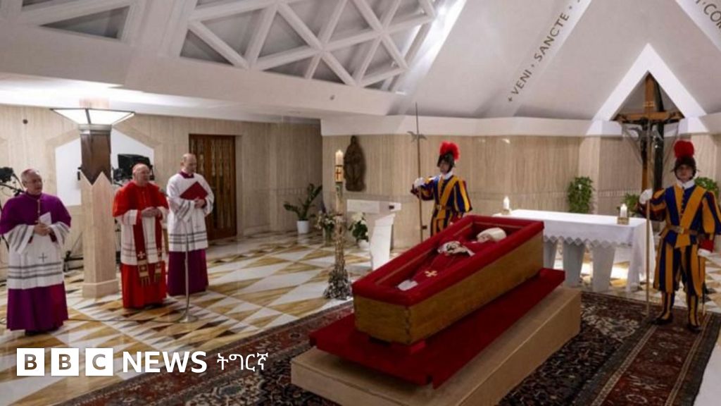ቫቲካን ዘውጽኦ ስእልታት ከምዘመልክቶ፡ ሬሳ ናይቶም መራሒ ሰዓብቲ ካቶሊካዊት ቤተክረስትያን ዝኾኑ ፍራንሲስ ኣብ መንበሪኦም ኣብ ዝርከብ ቤት-ጸሎት (ቻፕል) ኣብ ክፉት ሳንዱቕ ኣትዩ፡ ብሓለዋ ስዊስን ካርዲናላትን ተኸቢቡ ይርአ።