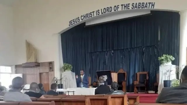 መራኸብቲ ሓፋሽ ደቡብ ኣፍሪቃ፡ ኣገልጋሊ እታ ቤተ-ክርስትያን ኣብ መድረኽ ኰይኑ እናሰበኸ እንከሎ፡ ሽድሽተ ዕጡቓት ናብታ ቤተ-ክርስትያን ከም ዝኣተዉ ፀብፂበን።