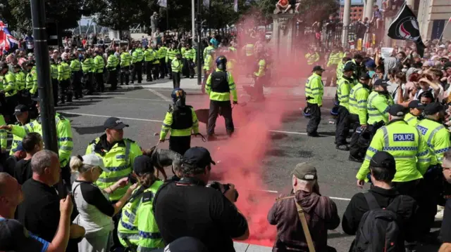 ኣብ ሊቨርፑል ሰልፈኛታት ሕጡብ፡ ጥርሙዝን ዝተቐጻጸለ ነገራትን ኣብ ልዕሊ ፖሊስ ክድርብዩ እንከለው፡ ሓደ ፖሊስ ካብቶም ሰልፈኛታት ብዝተደርበየ ወንበር ኣብ ርእሱ ተሃሪሙ፤ ካልእ ድማ ካብ ሞተር ብሽክለታኡ ወዲቑ።