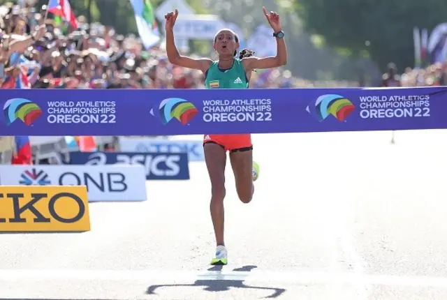 ሓደ ኪሎ ሜትር ኣብ ዝተረፈሉ ኣትሌት ጎተይቶም ገብረስላሰ ነታ ንነዊሕ ኪሎሜትራት ነቲ ውድድር ክትቅልሶ ዝውዓለት ኬንያዊት ኮሪሪ ራሕሪሓታ ብምኻድ፡ ኣብ ማራቶን ቻምፕዮን ዓለም ተመዝጊቡ ዝፀነሐ ግዘ ብምምሕያሽ ተዓዋቲት ወርቂ መዳልያ ኮይና።