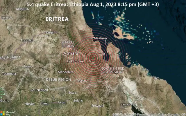 እዚ ክስተት እዚ’ውን፡ ካብ ባጽዕ 38 ኪ.ሜ፡ ደቀምሓረ 47፡ ዓዲቐይሕ 48፡ ዓዲ ግራት 111፡ ከረን 119፡ ኣኽሱም 149 ከምኡ’ውን መቐለ 197 ኪ.ሜ ርሒቝ ዝርከብ ኰይኑ፡ ከከም ርሕቀቱ ዝፈላለ መጥን ምንቅጥቃጥ ምድሪ ከም ዝተሰምዐ ማእከል ጂኦሳይንስ ጀርመን ኣፍሊጡ’ሎ።