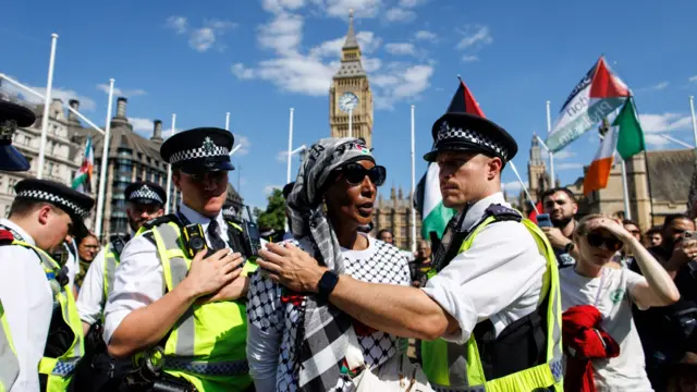'ዲፈንድ ኣዋር ጁሪስ' ኣብቲ ኣብ ኣብ ዌስትሚንስተር ፓርላመንት ስኴር ኣብ ዘዳለዎ ተቓውሞ፡ ን'ፓለስታይን ኣክሽን' ዝድግፍ መልእኽቲ ሒዞም ዝተረኣዩ ሰልፈኛታት እዮም ኣብ ቀይዲ ኣትዮም ዘለዉ።