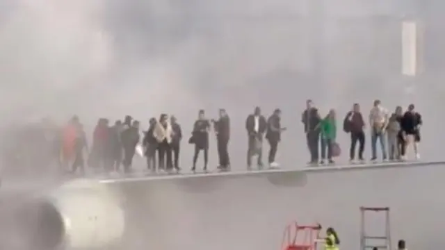 ካብ ናይ ጸጥታ ካሜራ ዝተረኸበ ምስሊ፡ እቶም ተጓዓዝቲ ኣብ ክንፊ ናይታ ነፋሪት ቦይንግ ተኣኪቦም፡ ገሊኦም ምስ ቦርሳታቶም እንከለዉ፡ ኣብ ጥቓ ታሕተዋይ ክፋል እታ ነፋሪት ሃልሃልታ ይነድድ ከምዘሎ የርኢ።