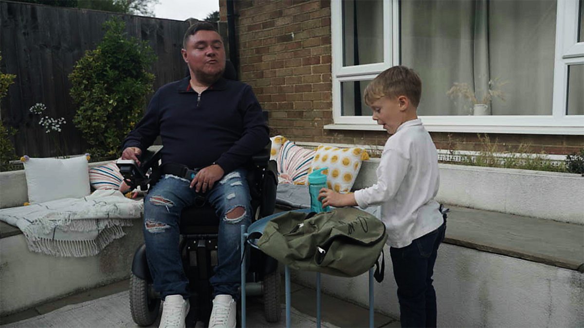 4-year-old Rowan and his dad, who sits in a wheelchair, are packing a bag together in their garden.