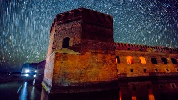 Not many tourists make it to this remote national park, however. It sits 68 miles west of the nearest city, Key West, and getting there takes two hours by ferry. The park, which spans a hundred square miles, is mostly open water and contains seven small islands, which means that only 1% of the park is situated on dry land. But its isolation is a boon to those who do come, as it virtually guarantees jaw-dropping views of the celestial dance unfolding in the sky – such as the moment at 1:37, when the sun fully sets and the stars begin to glimmer.