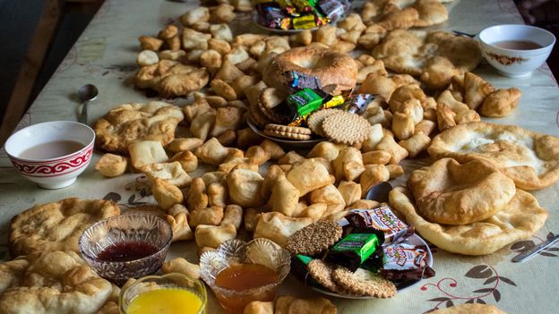 The difference is that they aren’t sweet. Though you can add jam or honey, many Kyrgyz eat them savoury and plain: a toothsome accompaniment to plates of chopped tomatoes and cucumbers, horse-milk butter and endless cups of tea. Variations of borsook are found throughout Central Asia, including in Kazakhstan and Uzbekistan (where it is often shaped into balls) and Tajikistan (where it is given a decorative criss-cross pattern with a strainer).
