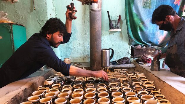 The ingredients are important, but when it comes to authentic chainaki, it all comes down to the clay teapot. "A lot of people in Afghanistan have started using different pots for preparing chainaki. If you make it in an ordinary dish, it becomes shorwa," said Wahidullah, noting that the clay teapot is what gives the thick lamb stew its distinct taste and smell. Bacha Broot's kitchen surface is covered with colourful rows of chainaki teapots, all simmering with their precious delicacy and kept hot by coal embers beneath. Tea, which is prepared in a separate vessel, can be requested alongside the meal.