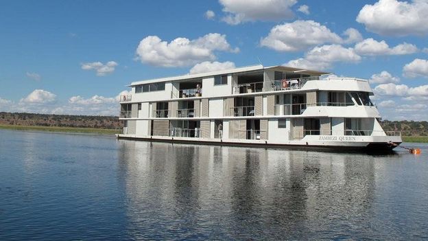 The Zambezi Queen, a sleek 14-room river boat, sails along the Chobe River, through one of Africaâs densest concentrations of wildlife. (Colleen Clark)