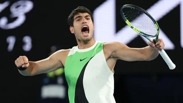 Henüz 22 yaşındaki Alcaraz, Melbourne'de Djokovic'le oynadığı maçta 2-6, 6-2, 6-3, 7-5 biten setlerin ardından başarısını coşkuyla kutladı.