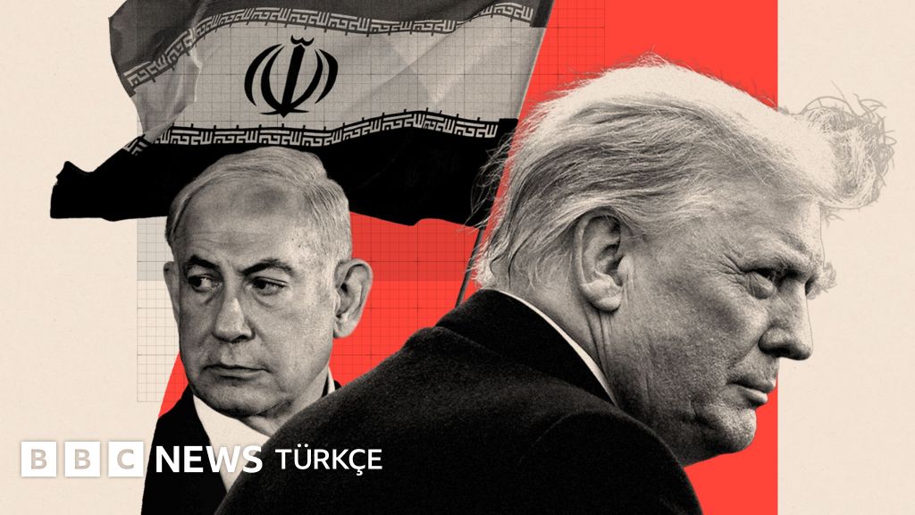 Binyamin Netanyahu ve Donald Trump'ın yakın çekim fotoğraflarının yer aldığı ve arka plana İran bayrağının eklendiği bir kolaj.