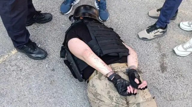 İçişleri Bakanı Ali Yerlikaya'nın paylaştığı videoda, saldırganın üzerinden çıkanları gösteren bir görselde miğfer, hücum yeleği, bir balta ve iki bıçak olduğu görüldü.