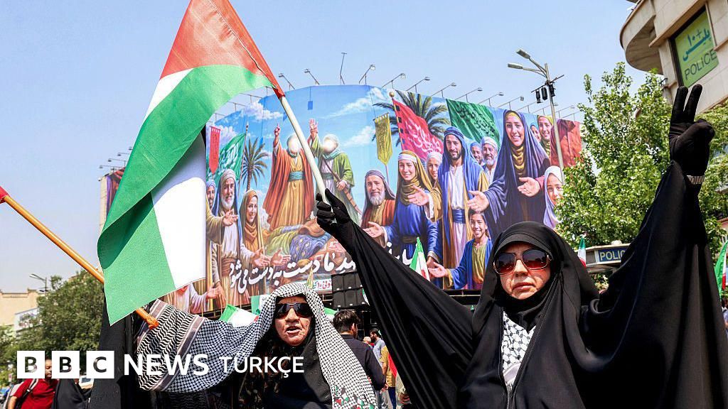 Fotoğraf altı yazısı, Tahran'da 13 Haziran'da düzenlenen İsrail karşıtı gösterilerden bir fotoğraf.