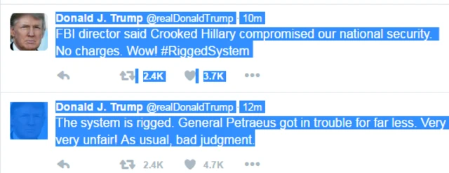 "FBI Başkanı, sahtekar Clinton'ın ulusal güvenliğimizi tehlikeye attığını söyledi. Ama herhangi bir suçlama yok.