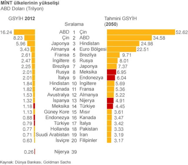 2001'de dünya ekonomisinin lideri olarak Brezilya, Rusya, Hindistan ve Çin'in oluşturduğu BRIC ülkeleri konuşuluyordu. Bu terimi icat eden Jim O'Neill, şimdi içinde Meksika, Endonezya, Nijerya ve Türkiye'nin yer aldığı MINT ülkelerini ekonominin yeni devleri olarak tanımlıyor: