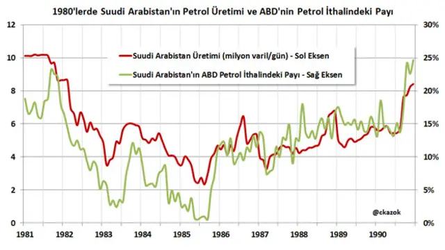 Tam da ABD'deki üretim artışının saman alevi olmaması nedeniyle Suudi Arabistan, bu sefer yoğurdu üfleyerek yiyor. Bu sefer, çünkü aşağıda görüldüğü üzere Suudi Arabistan 1980'lerin ortalarında fiyatlardaki düşüşün önünü kesmek için üretimi kısınca hem düşüşü engelleyememiş, hem de geçici de olsa o zamanki başlıca müşterisi ABD'nin ham petrol ithalinde çok büyük pay kaybetmişti.