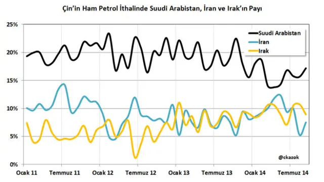 Bugün Suudi Arabistan için başlıca müşteri olarak ABD'nin yerini Çin almış durumda. Aşağıdaki grafik, Çin'in ham petrol ithalinde Suudi Arabistan'ın azalan, İran ve Irak'ın artan payını gösteriyor.