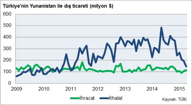 Türkiye'nin Yunanistan'a gerçekleştirdiği aylık ithalat yıllardır 100 milyon dolar civarında dar bir bantta dalgalanırken, Yunanistan'dan yapılan ithalat özellikle 2014'ün başlarında ayda 500 milyon dolara yaklaştı, ancak sonra sert bir düşüşe geçti.