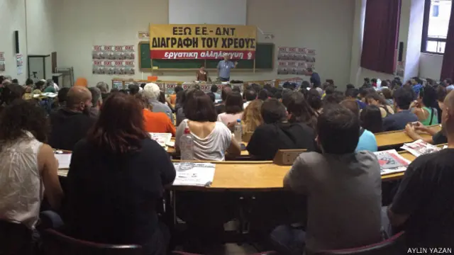 Bu kez Atina Ekonomi Üniversitesi'ndeyim. Devlet üniversitesinin "OXI" (Yunanca 'hayır') posterleriyle kaplı koridorlarından ulaşılan bir anfide toplanmışlar.