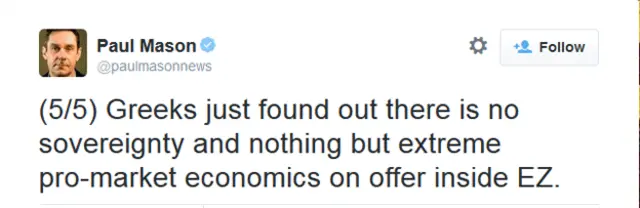 "Yunanlılar Euro Bölgesinde ulusal egemenlik diye bir şey olmadığını, sadece aşırı piyasa yanlısı ekonomik politikaların geçerli olduğunu öğrenmiş oldular."
